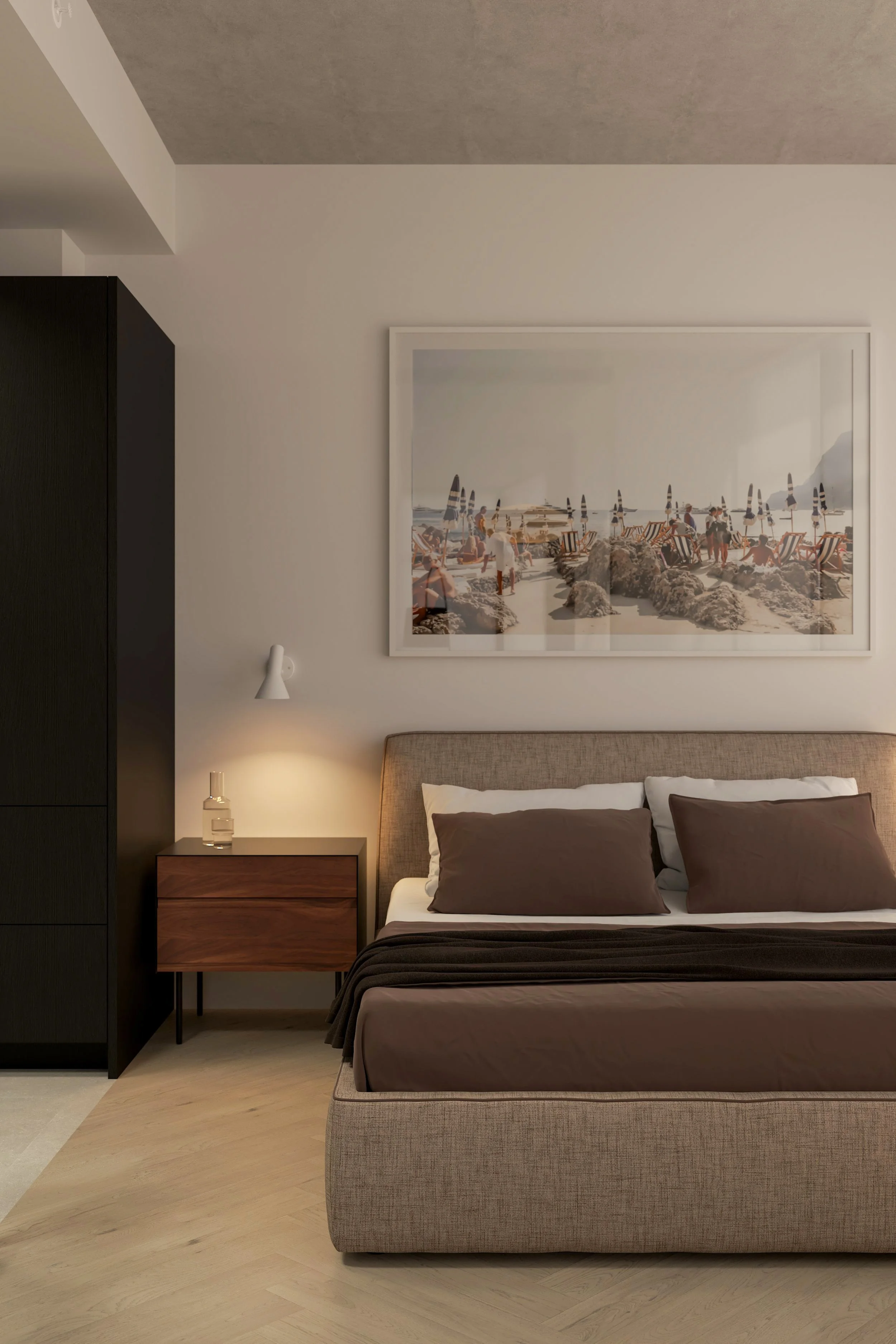 Herringbone flooring, black oak millwork, and bold stone surfaces establish a striking contrast, while layered soft furnishings and ambient lighting soften the palette. The result is a refined yet inviting retreat — an urban sanctuary designed for lounging and relaxation above the energy of the city below.