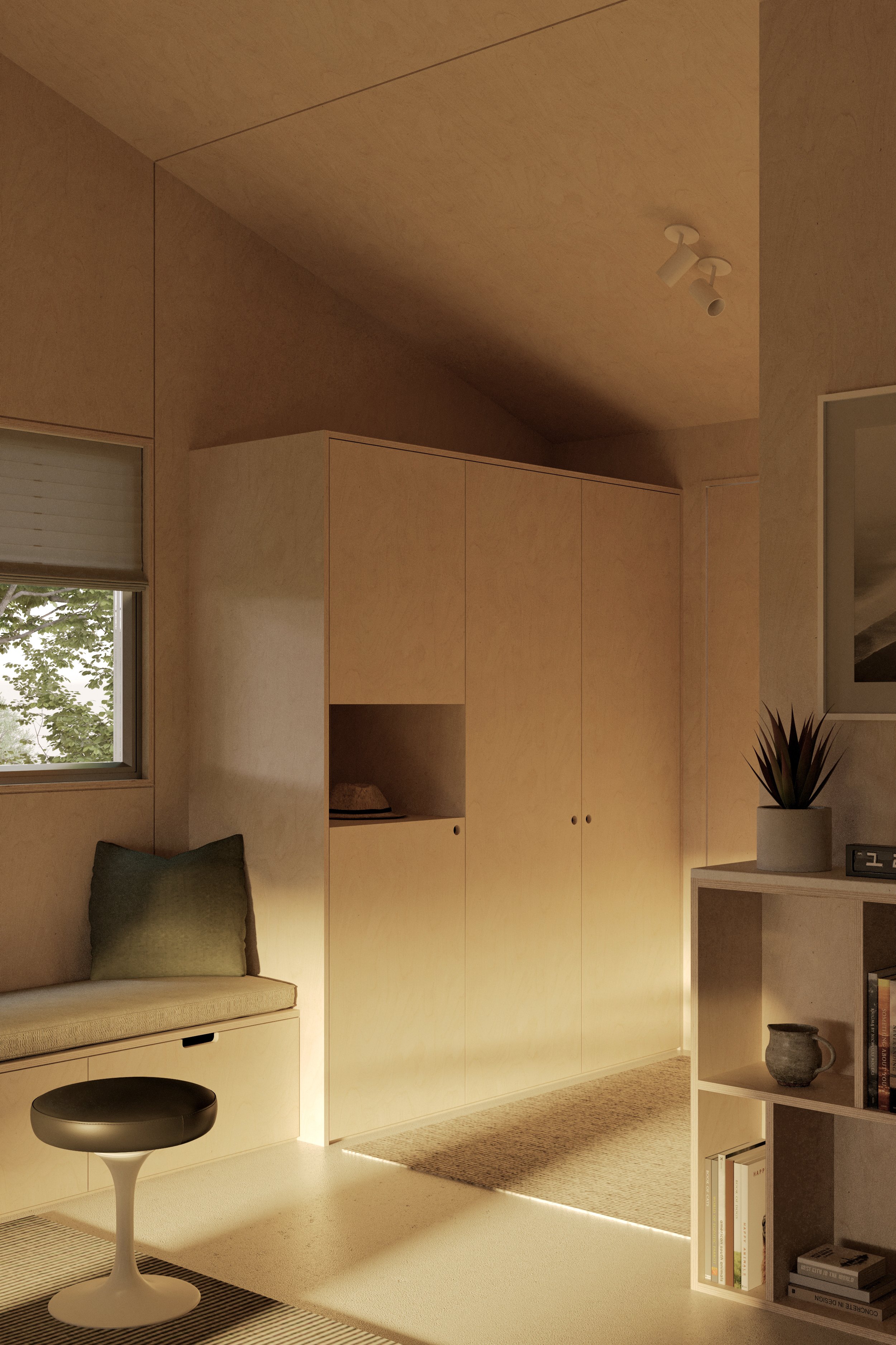 Nestled in a quaint pocket of Vancouver Island, this cabin was designed to embody the essence of coastal living, with plywood serving as the primary material throughout the interior. The brief called for a space that could support an active, outdoor-driven lifestyle while also offering moments of calm and retreat.
